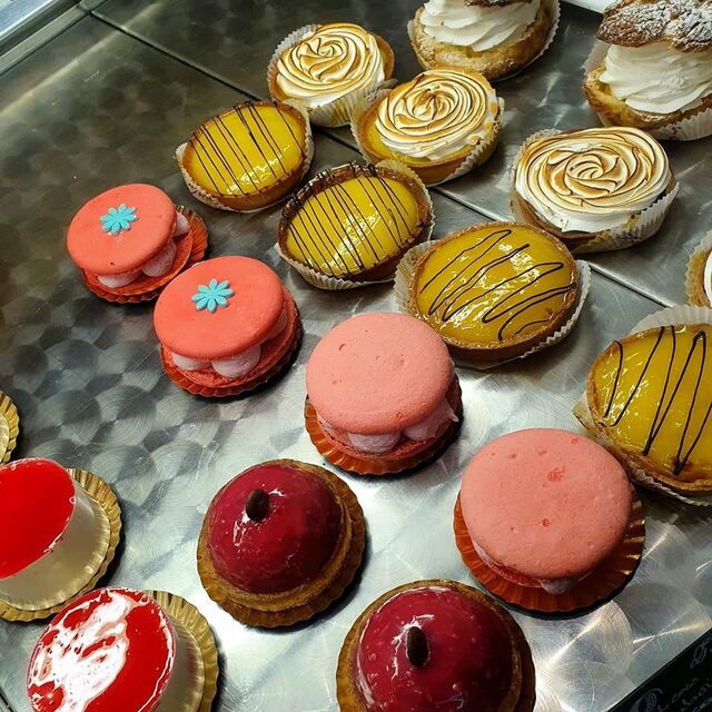 Retrouvez les classiques de la boulangerie et de la pâtisserie française : croissants, pains au chocolat, tarte au citron, choux à la crème. Mais également des dômes framboise, tarte aux noix, Ferrero rocher, Mont Blanc …
